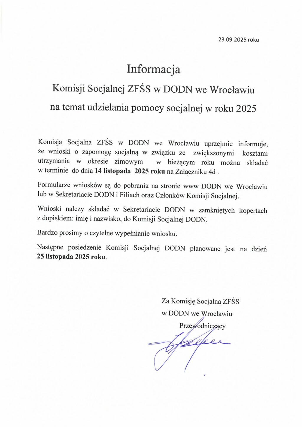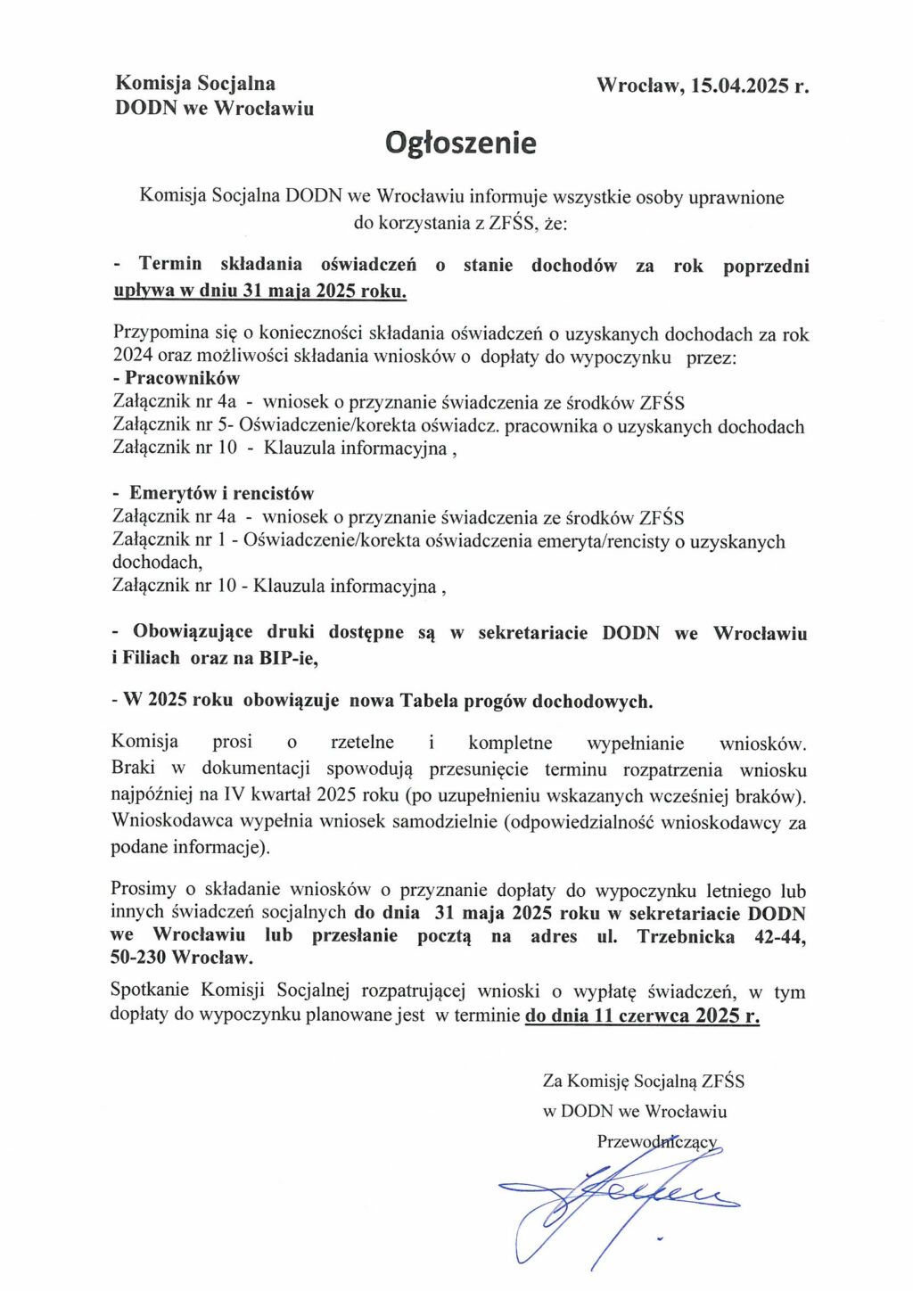 Aneks nr 1/2023 z dnia 30 marca 2023 roku do Regulaminu Zakładowego Funduszu Świadczeń Socjalnych DODN we Wrocławiu